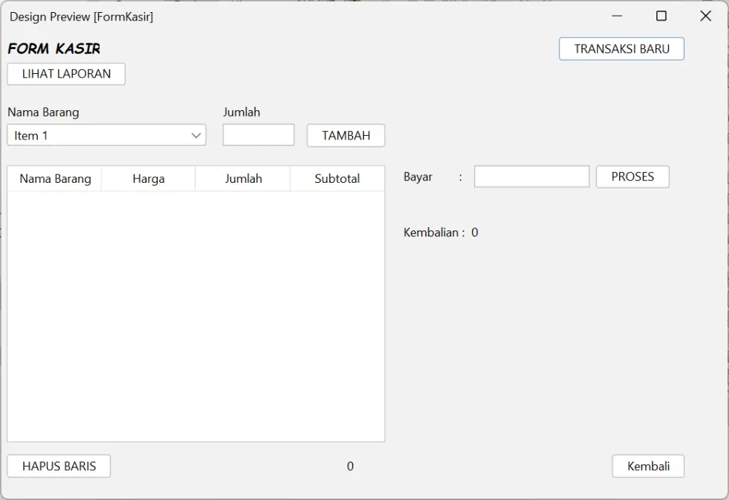 Form Kasir: Antarmuka transaksi interaktif dengan dropdown pilihan barang, perhitungan otomatis subtotal, total harga, dan kembalian.