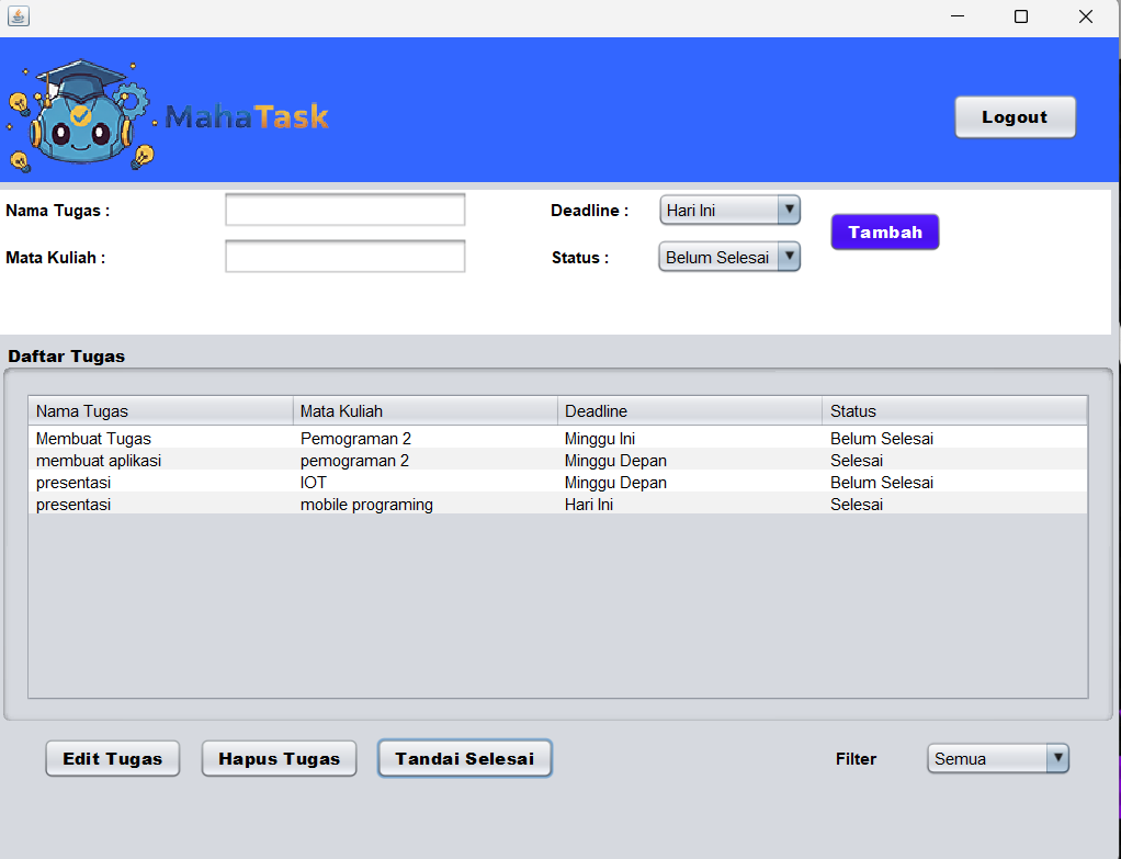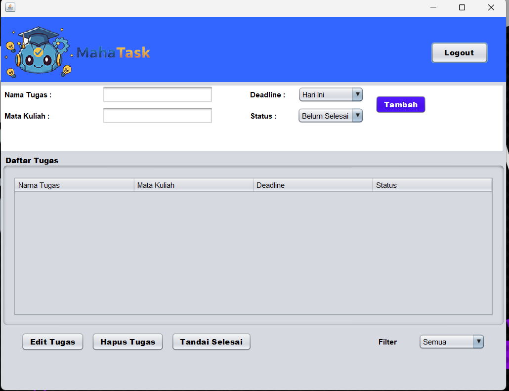 MahaTask dikembangkan menggunakan bahasa pemrograman Java dengan Java Swing sebagai antarmuka grafis, serta menerapkan konsep MVC (Model–View) tanpa menggunakan database, sehingga data dikelola langsung di dalam aplikasi. Dengan antarmuka yang sederhana dan mudah dipahami, MahaTask diharapkan dapat membantu mahasiswa menjadi lebih disiplin, terorganisir, dan produktif dalam menyelesaikan tugas akademik.