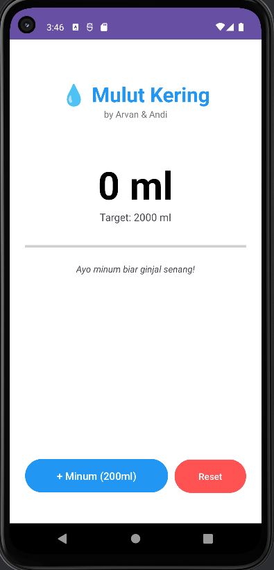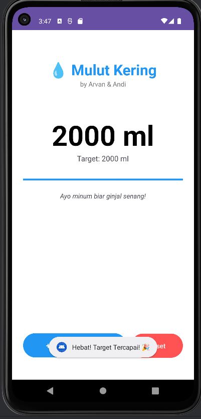 Aplikasi 'Mulut Kering' adalah alat bantu kesehatan sederhana berbasis Android yang dirancang oleh Arvan & Andi. Aplikasi ini berfungsi membantu pengguna memantau asupan air harian mereka dengan fitur pencatatan volume air (ml), visualisasi progress bar, dan penyimpanan data lokal (local storage) agar riwayat minum tidak hilang meski aplikasi ditutup.