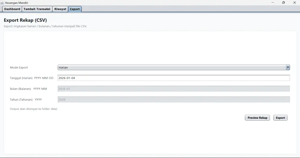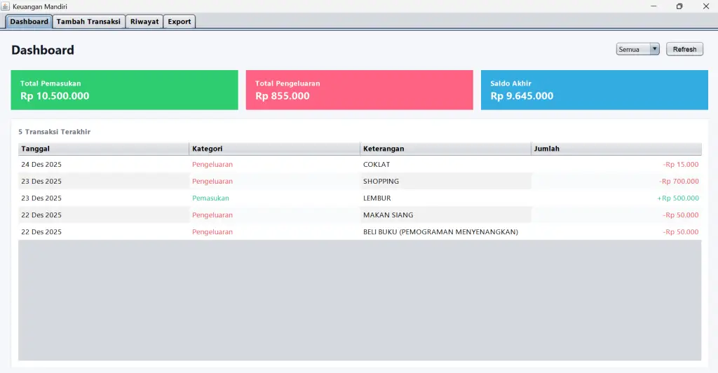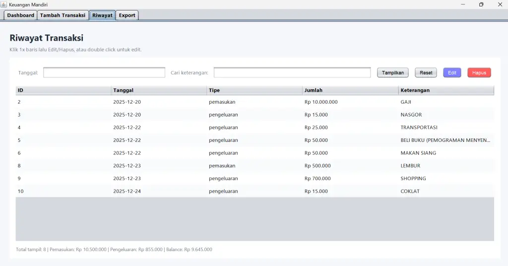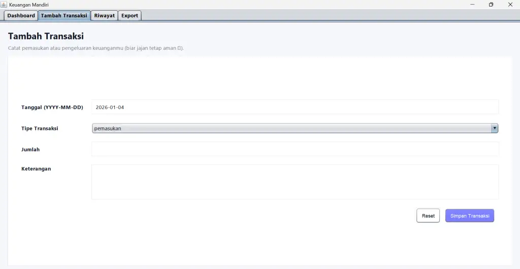 SIMANDI merupakan aplikasi desktop berbasis Java yang dirancang untuk membantu pengguna dalam mengelola dan mencatat transaksi keuangan mandiri secara sederhana, terstruktur, dan mudah digunakan. Latar belakang pengembangan aplikasi ini adalah masih banyaknya pencatatan keuangan pribadi yang dilakukan secara manual, seperti menggunakan buku catatan atau metode tidak terorganisir, sehingga berpotensi menimbulkan kesalahan pencatatan, data tidak rapi, dan sulit untuk menelusuri riwayat transaksi.